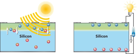 Strahlt die Sonne auf die Solarzellen, baut sich zwischen der Ober- und Unterseite eine Gleichspannung auf und Strom kann fließen. Handelsübliche Solarzellen erreichen einen Wirkungsgrad bis zu 20 % und werden zu Solarmodulen verschaltet.