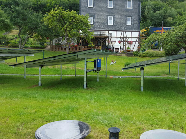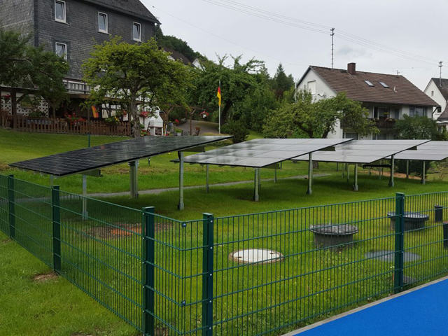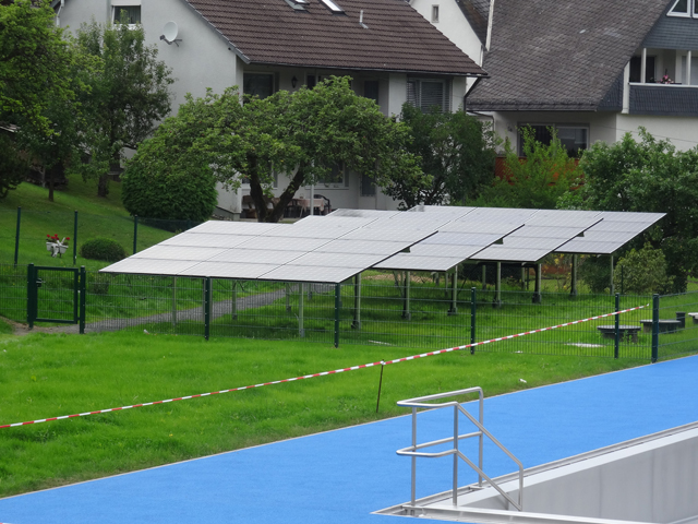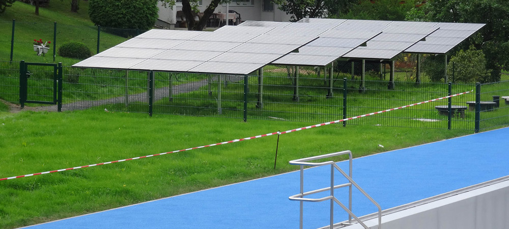 Das Ingenieurbüro Schaumburg hat im Zuge der Sanierung des Schwimmbades bei der sie unter anderem auch die Badewasseraufbereitung saniert haben, die Planung, die Ausschreibung und Bauleitung für die PV-Anlage gemacht. Da die zur Verfügung stehenden Dachflächen mit Solarabsorbern zur Erwärmung des Beckenwassers belegt werden sollten, kam nur eine auf den Eigenverbrauch des Objektes optimierte und kompakte Freiflächenanlage auf einem wenig attraktiven und nun abgezäunten Bereich der Liegewiese in Betracht. Mit der Entwurfsplanung haben sie Anfang des Jahres begonnen und die Anlage wurde planmäßig (Kosten und Termine) Anfang August von unserem regionalen Partner, der Fa. HBGE, in Betrieb genommen.