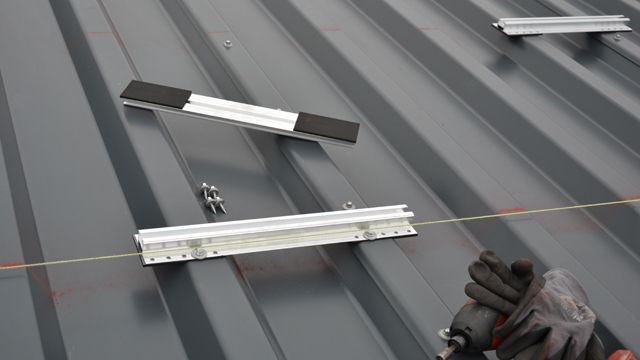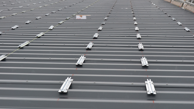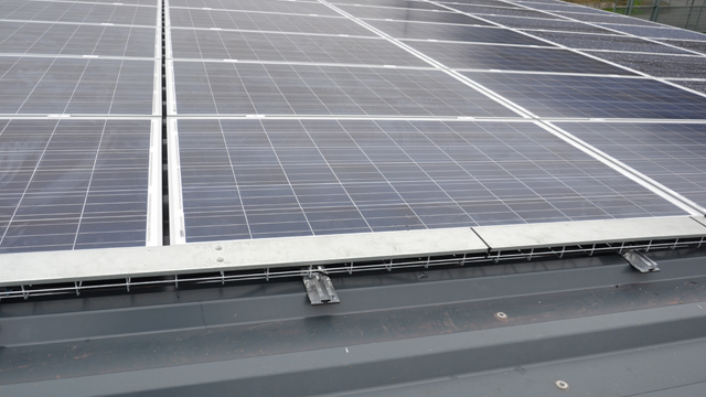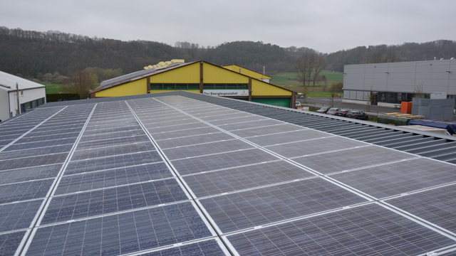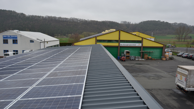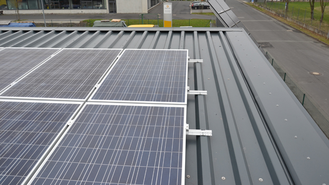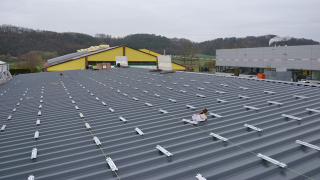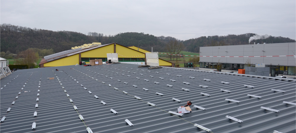 Auf unserem neuen Aluminiumprofillager am Standort Cölbe errichteten wir eine weitere 29,9 kWp Anlage für die Stromversorgung unser TRIC Produktion und Verwaltung. Hierfür wurde auf dem Trapezblech des Aluminiumprofillagers das verbesserte Dachanker TR fix S de luxe System mit schon vorgeklebten Neoprenkissen eingesetzt. Bei diesem System entfällt das lästige und zeitraubende Bekleben der Hochsicken auf der Baustelle und man spart so wertvolle Montagezeit. Die kurzen Schienenstücke werden lediglich an die korrekte Position gelegt und mit dem Trapezblech mittels selbstfurchenden Dünnblechschrauben verschraubt. Als Befestigung der Module dient auch hier die bewährte Modulklemme TRIC Clip. Die erfahrene Montagefirma G+H Solar GmbH errichtete in Rekordzeit die Anlage und der Bauleiter von G+H Solar freute sich über die schnelle Montagezeit; „Die Montage der Anlage ging wie´s Katzen machen!“, nachdem er und seine Monteure die Anlage nach ca. 1,2 Tagen fix und fertig errichtet hatten.