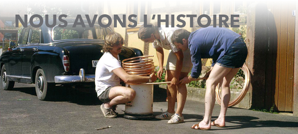 La première installation solaire - ÉTÉ 1978Nous avons réalisé la première installation dès 1978, avant même la création de notre entreprise. Nous étions un groupe d’étudiants gais et engagés et avons fondé le groupe énergétique de Marburg. Nous nous préoccupions de thèmes comme l’énergie éolienne, le biogaz, la pyrolyse, l’énergie solaire et la construction alternative. Lors de rencontres régulières nous échangions nos expériences, des livres et des magazines sur ces thèmes et discutions vivement. Quelques-uns passaient à l’action et ont construit une première installation solaire pilote. |